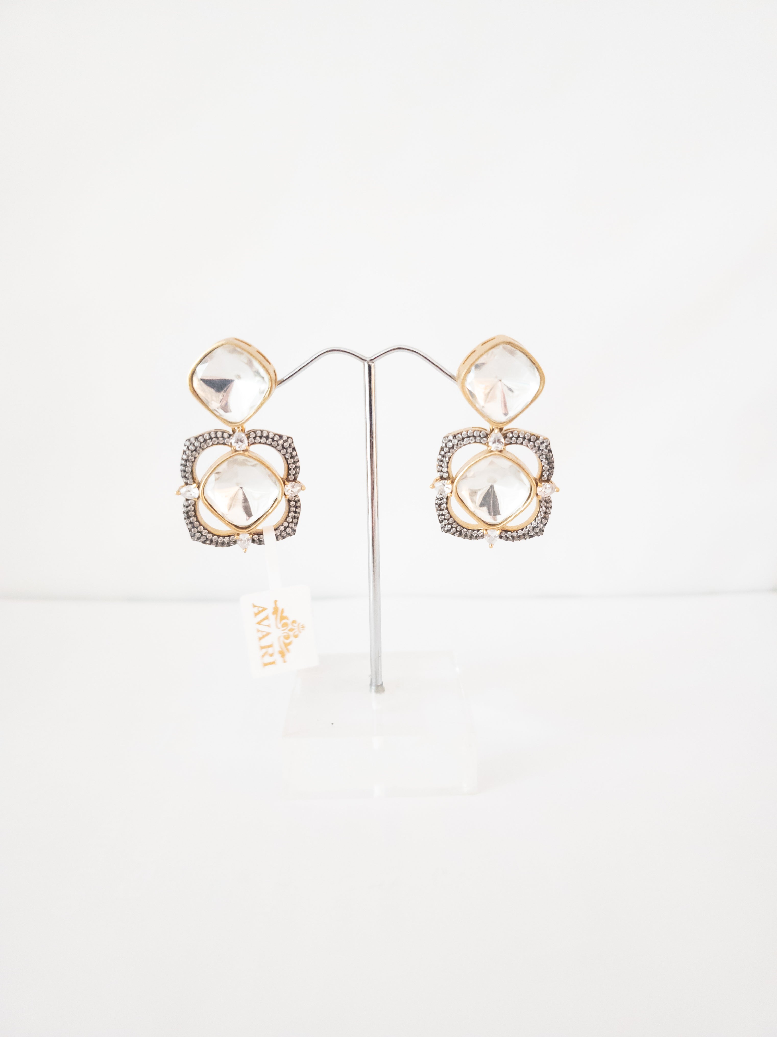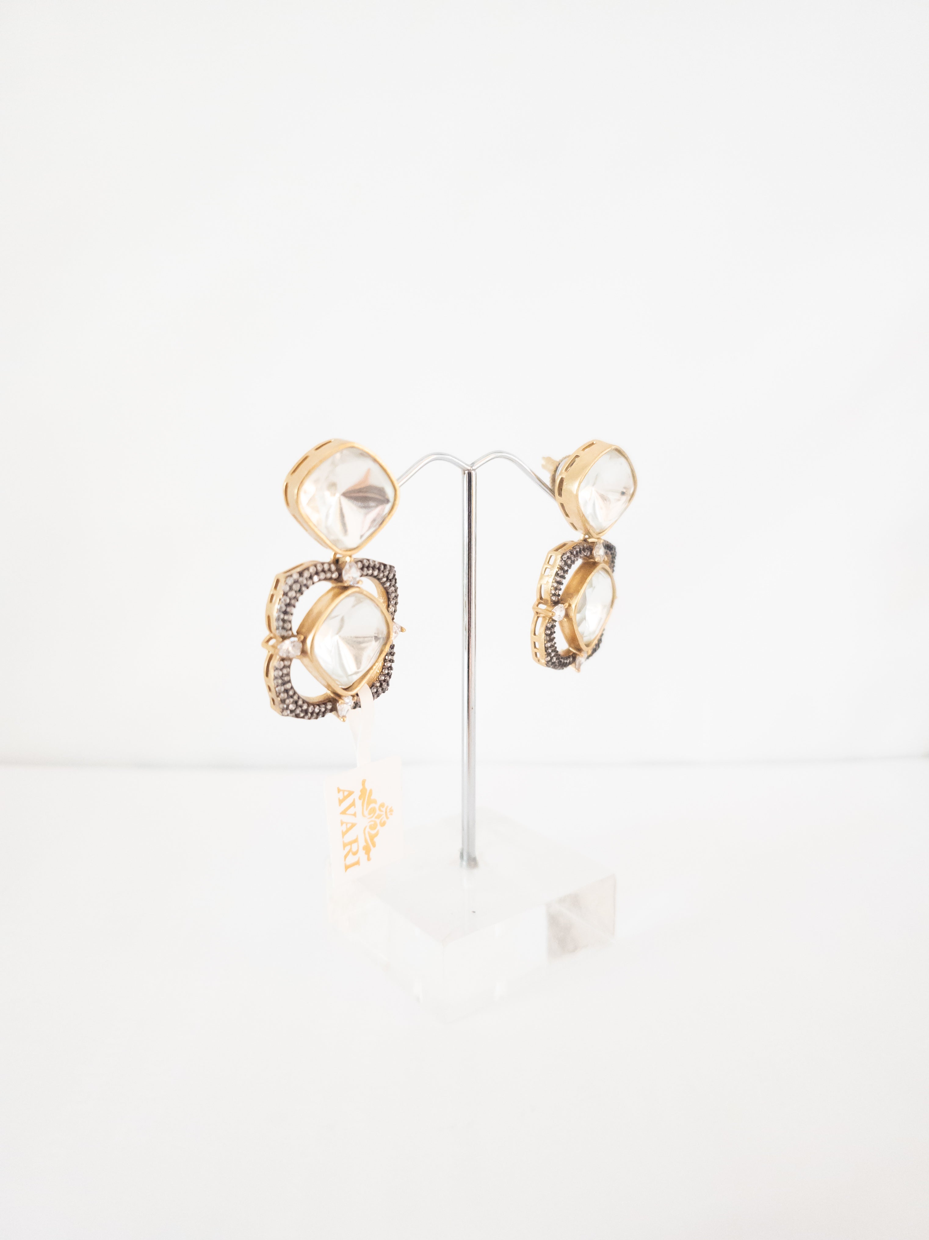From this delicate band, dramatic tiers of pear-cut Kundan stones and micro-pearl clusters cascade downward, finished with a lush fringe of tumbled seafoam-green beads. The oversized chandelier earrings mirror the tiered floral design, creating a regal silhouette perfect for the most grand occasions.