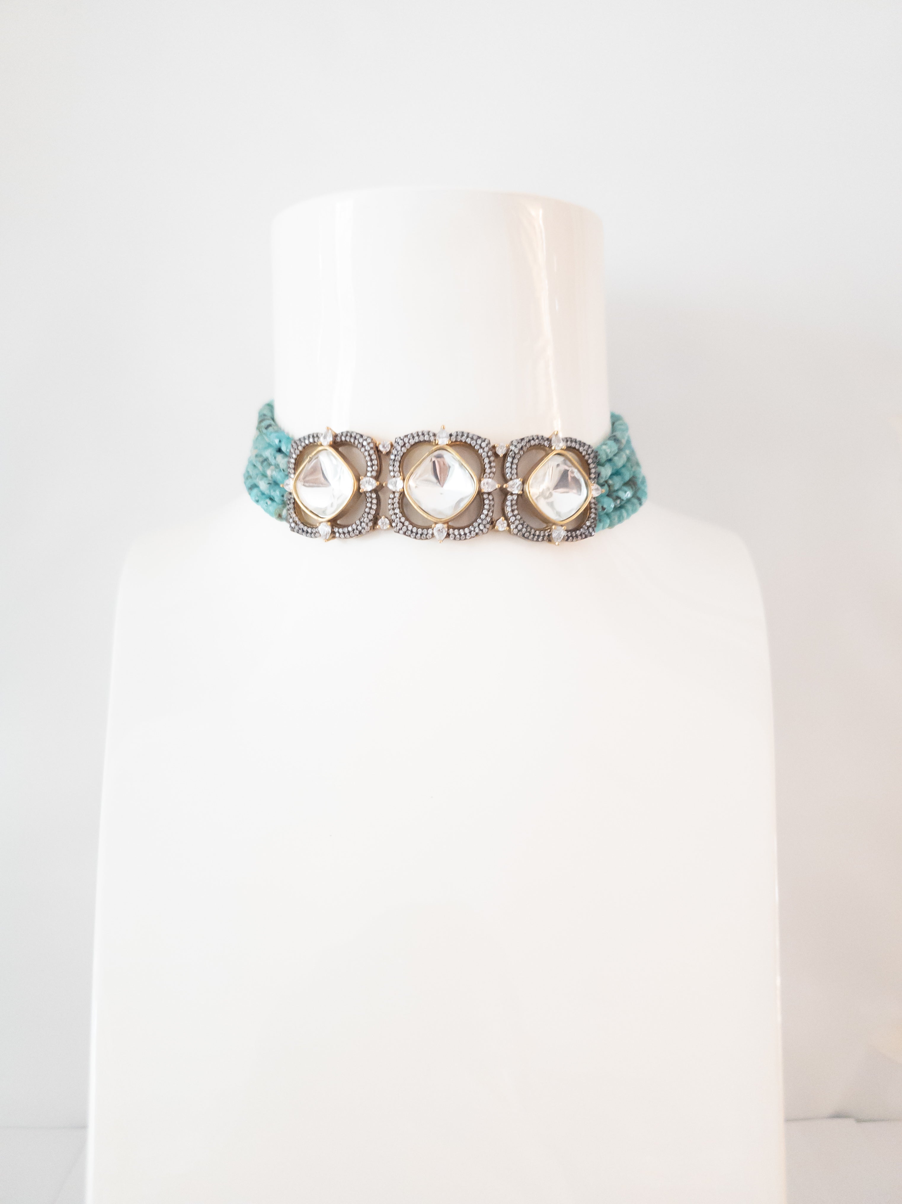 A garden of timeless elegance. Part of the AVARI Signature Collection, the Seafoam Flora Set is an exquisite display of intricate craftsmanship. This breathtaking choker is designed with a high-neck band of mint-green carved floral motifs, each centered with a shimmering Polki stone.